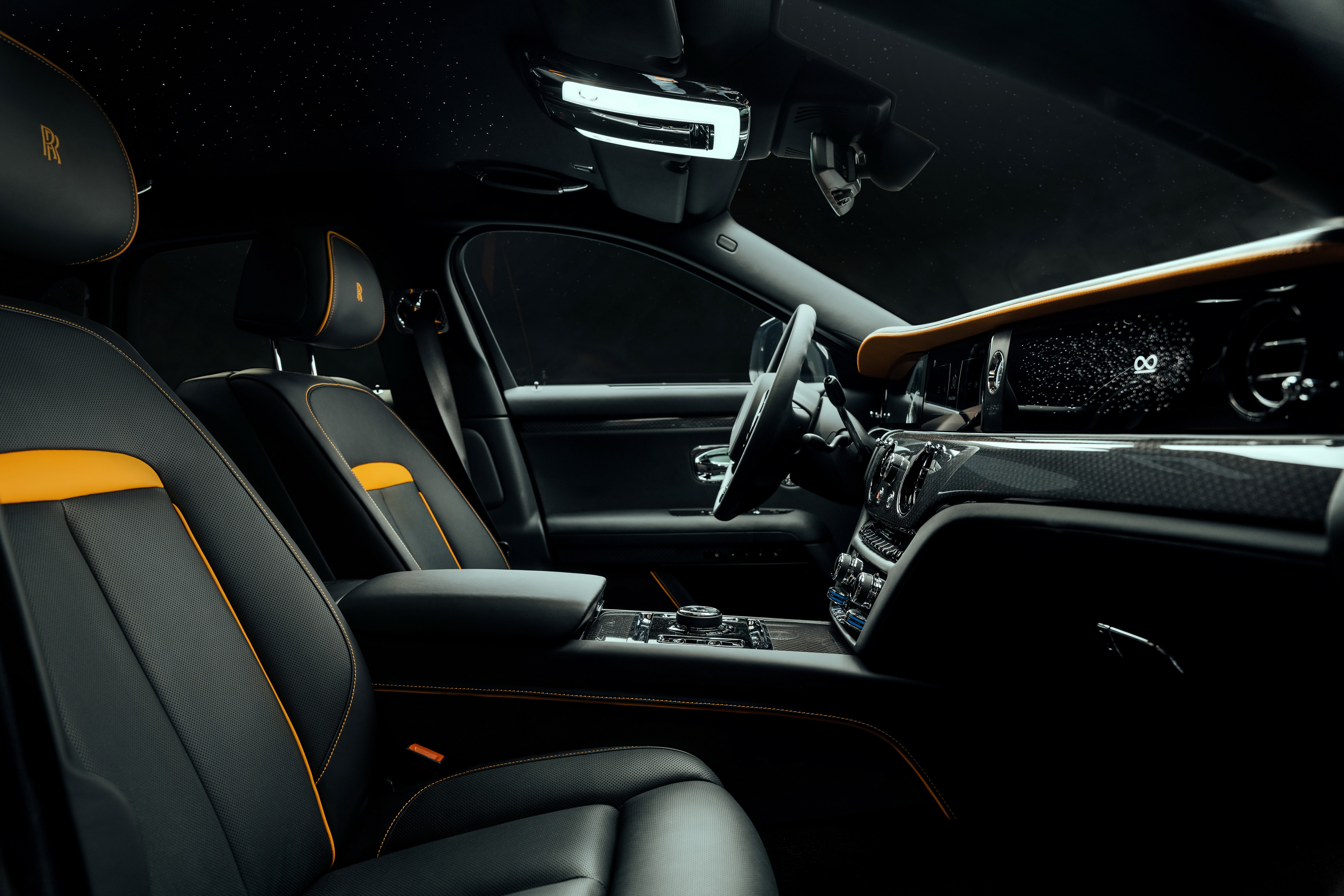 in English: SPOFEC performance and design for the Rolls-Royce Black Badge Ghost 519 kW / 706 hp and 1,002 Nm torque for the V12 Sport exhaust system with electronic sound management Carbon aerodynamics upgrade and 22-inch forged wheels |